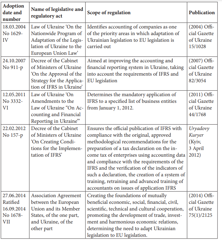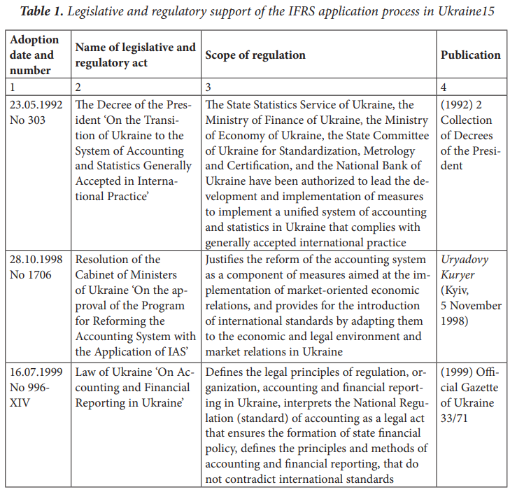 The process of applying IFRS in Ukraine in the development of legislative and regulatory support for accounting and reporting was started in 1998, when the resolution of the Cabinet of Ministers of Ukraine dated October 28, 1998 No 1706 approved the Program for reforming the accounting system with the application of international standards.13 The Decree of the President of Ukraine, dated May 23, 1992, was the first legislative act defining the prerequisites for applying IFRS in Ukraine ‘On the transition of Ukraine to the system of accounting and statistics generally accepted in international practice’.14 Since then, several normative documents have been adopted in Ukraine, which regulate the application of IFRS and contain various clarifications for companies, auditing firms, and controlling and coordinating state authorities (Table 1).15