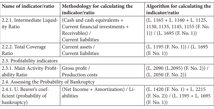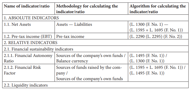 Table 2. The system of indicators (ratios) and their calculation method for assessing the financial condition of enterprises (L. — financial statement line; F. No. 1 — Financial reporting form No. 1 ‘Statement of Financial Position’ (Balance sheet); F. No. 2 — Financial reporting form No. 2 ‘Profit and Loss Statement and other comprehensive income’)20