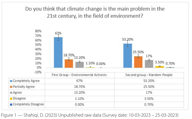 To give credibility to the research on this topic and the connection with climate change, in one of our surveys, we posed the question: ‘Do you think that climate change is a main problem of the 21st century?’ This question was raised to discern people’s perceptions regarding climate change, gauging whether they view it as a defining challenge of this century. Importantly, it should be noted that the research was extended to two groups of people: marginalised environmentalist groups and the general public. Their answers first underwent analysis via the Chi-square method, performed by SPSS, to identify if there are significant differences in attitudes.