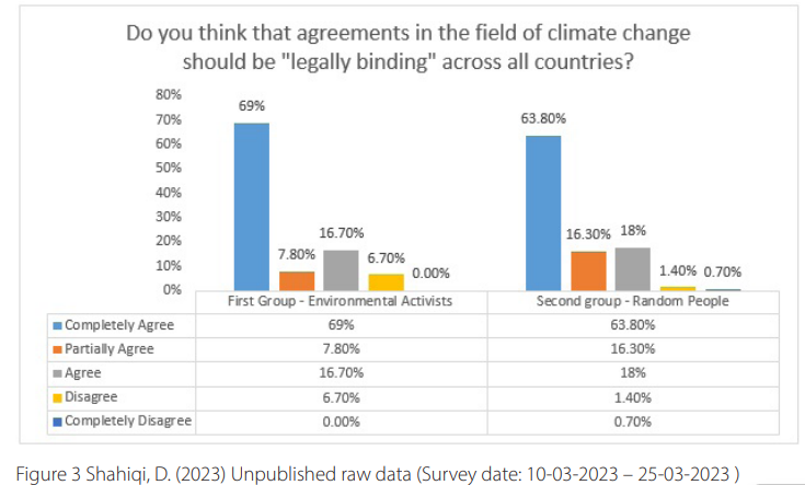 We compared the two groups’ answers to identify disparities in their opinion. By measuring public opinion, we can gain a more explicit idea of public sentiment regarding the adequacy of the appropriate legal framework for combating climate change and the desirability of legally binding agreements.