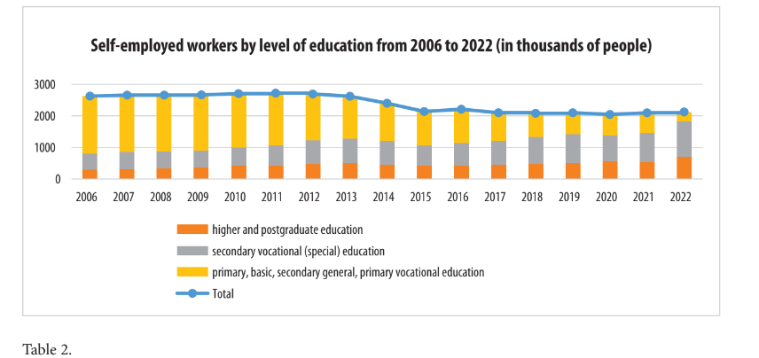 The data presented below indicate the dynamics of changes in the number of self-employed people in the RK for the period from 2006 to 2022 (Table 1). The data in Table No. 2 shows the number of self-employed, divided by the level of education in the period from 2006 to 2022 (higher and postgraduate education; technical and vocational education; primary, basic, and general secondary education).