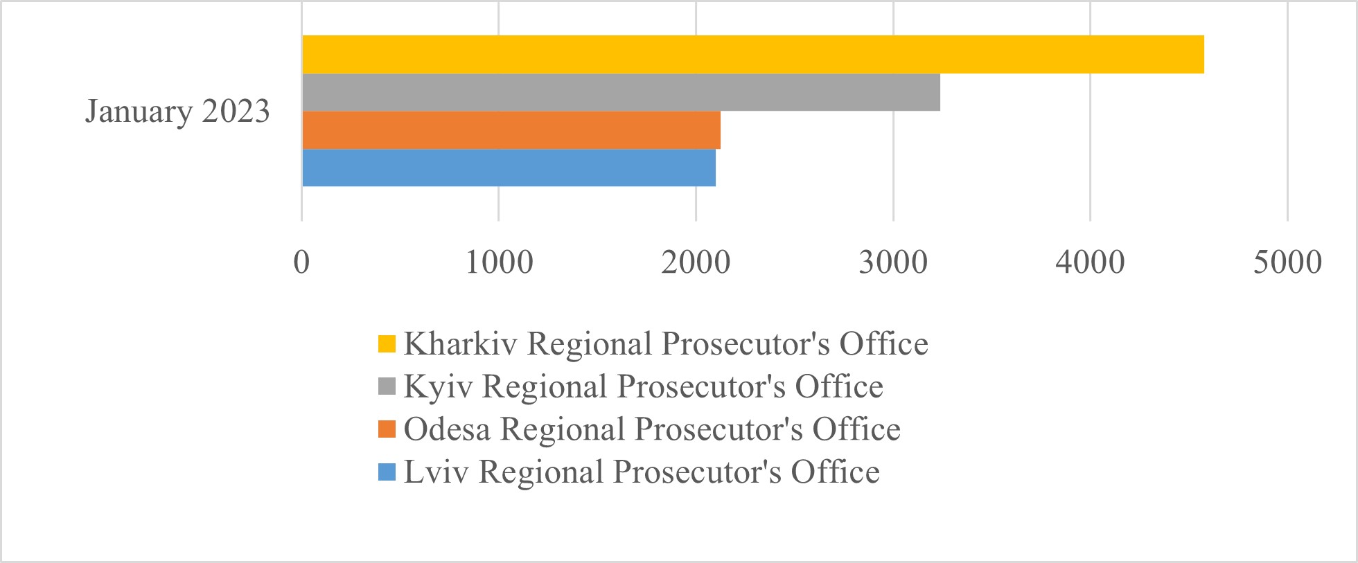 The constitutional level of the specified functions requires attention on the issue of their implementation in the conditions of martial law. This will make it possible to show the impact of the war on the Prosecutor’s Office and clarify the specificity of its wartime activity. To do this, we will apply generalization of statistical indicators of accounting for criminal offences and use the indicators for January 2023, provided by the Prosecutor’s Offices of Ukraine’s relevant regions for comparison.