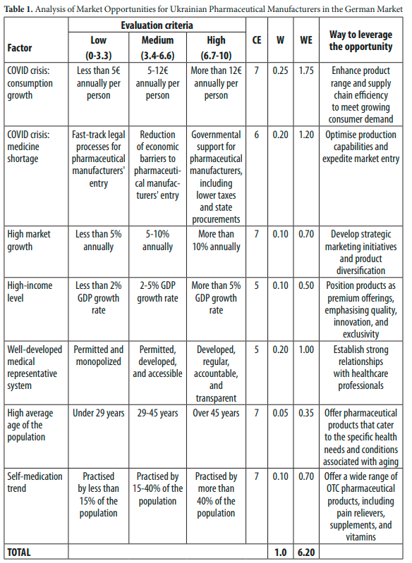 Table 1 summarises market opportunities for Ukrainian pharmaceutical manufacturers in the German market. Each factor is assessed based on specific criteria with an assigned evaluation score (CE) and weight (W). The weighted evaluation (WE) is obtained by multiplying the CE with the assigned weight. The total weighted evaluation reflects the overall potential for market opportunities, which in this case is 6.20.59