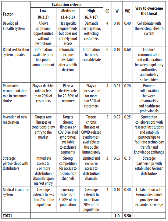 On the other hand, Table 2 examines the threats confronting Ukrainian pharmaceutical manufacturers in the German market. These threats encompass a low corruption level, limited R&D financing, modest benefits for EU businesses, POM's high growth rate, rapid certification requirements updates, the influence of pharmacist recommendations on cus- tomer choice, and the availability of new medications. To mitigate these threats, Ukrainian companies should prioritise enhancing transparency and anti-corruption measures, increas- ing R&D funding, optimising costs through partnerships, closely collaborating with medical representatives, integrating with the existing EHealth system, improving communication and cooperation with regulatory authorities and industry stakeholders, promoting collaboration between pharmacists and healthcare professionals, strengthening ties with research institu- tions, establishing strategic partnerships with distributors, and collaborating with German insurance providers for broader coverage. Despite threats, the weighted evaluation of 5.50 indicates that the German pharmaceutical market offers more opportunities than challenges for Ukrainian manufacturers.