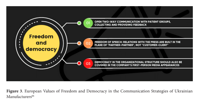 The survey results indicate that European consumers have a limited and somewhat narrow perception of Ukrainian products, mainly associating Ukraine with agricultural goods. However, their overall perception of Ukraine tends to be neutral, which creates an opportunity to shape new stereotypes and associations. Notably, the ongoing war and Ukraine's struggle against Rus- sian aggression have made freedom a significant value associated with the country. Although the concept of freedom may initially appear contradictory to quality assurance principles in production and health, it can be reframed as the absence of restrictions and limitations imposed by diseases and illnesses. Highlighting how pharmaceutical products promote a healthy state of the body and provide individuals with freedom from health-related constraints could be a compelling message for Ukrainian manufacturers in their communication strategies. By com- municating these values, Ukrainian companies could enhance their positioning in the German market, emphasising their commitment to ethical practices, patient-centric communication, and transparent operations (Fig. 3). It allows them to align with their target audience's values and showcase their products' positive impact on individuals' well-being and quality of life.